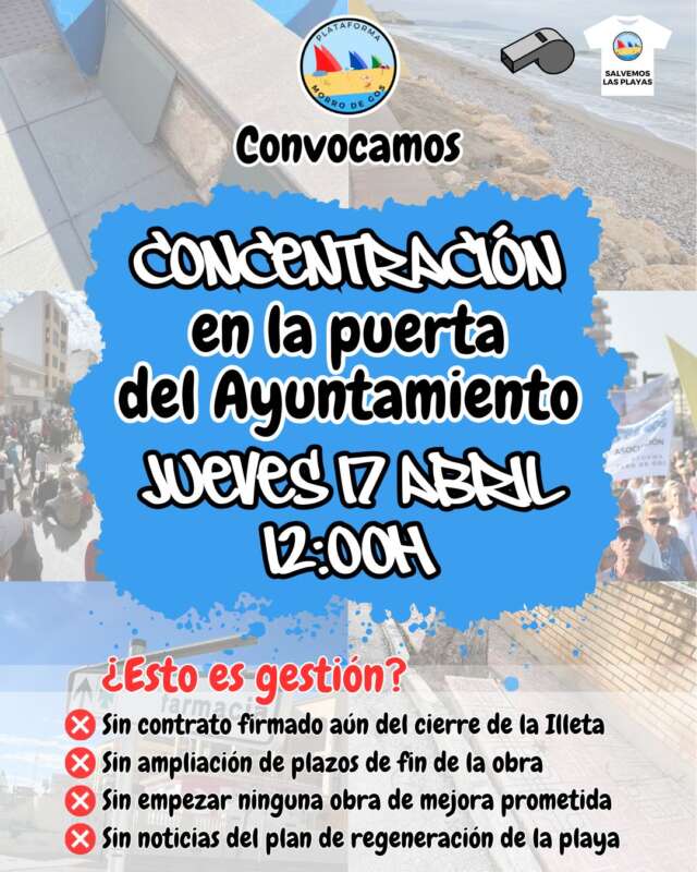La asociación Plataforma ‘Morro de Gos’ de Oropesa del Mar ha convocado una concentración el jueves 17 de abril a las 12.00 horas ante el ayuntamiento para reclamar avances en el cierre del canal de la Illeta. Los vecinos denuncian retrasos administrativos que podrían impedir la ejecución de las obras antes del verano, pese a que una empresa confirmó su disposición en febrero.