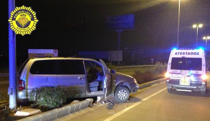 La Policía Local de Castellón intervino el sábado 17 de agosto, sobre las 22.15 horas en la Ronda Sur a la altura de los accesos a la Autopista AP-7, en un accidente de tráfico en el que estuvo implicado únicamente un turismo que, tras salirse de la vía, colisionó violentamente contra la mediana de la ronda de circunvalación y se quedó suspendido sobre la misma.