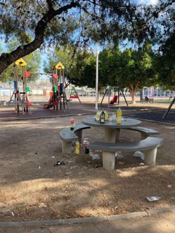 Diumenge sobre les 11 del matí el parc es trobava ple de restes de vidres trencats pel sòl i botelles al voltant d'on van els xiquets a jugar