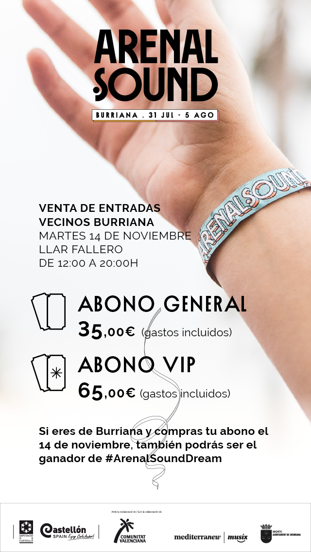 Quedan muy pocos días para que arranquen los preparativos de la novena edición de Arenal Sound. El próximo domingo 19 de noviembre salen a la venta las entradas para el público general, pero unos días antes los vecinos de Burriana podrán adquirir sus abonos a precio reducido de manera física.