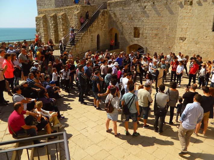 El éxito de acogida de las visitas teatralizadas que la Diputación de Castellón desarrolla en el Castillo de Peñíscola está provocando que se alargue la conocida como 'temporada alta' en el turístico monumento. Así, si los niveles habituales durante un domingo cualquiera se sitúan en torno a mil visitantes, a través de esta nueva iniciativa dinamizadora del Castillo se han alcanzado 2.050 visitantes en una misma jornada, una cifra de récord jamás alcanzada hasta ahora durante un día de mayo.