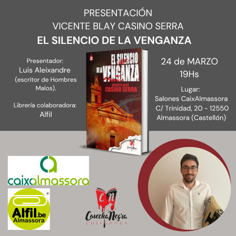 Vicente Blay Casino Serra presentará el próximo viernes, día 24, su nueva novela, ‘El silencio de la venganza’. Los salones de CaixAlmassora acogerán la puesta de largo del libro del escritor almassorí publicado por la editorial onubense Cosecha Negra Ediciones, galardonada el pasado verano con el premio a mejor editorial en el género negro en el Certamen CordoBlack.