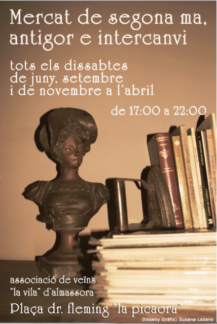 La Associació de Veïns La Vila de Almassora reabrirá mañana sábado su Mercat de segona mà, antigor i intercanvi en la plaza Doctor Fleming de la población. Entre las 17.00 y las 20.00 horas, media docena de vecinos de la localidad sacarán sus objetos a la calle para participar de un trueque que los vecinos del casco antiguo de la población promueven con este evento.