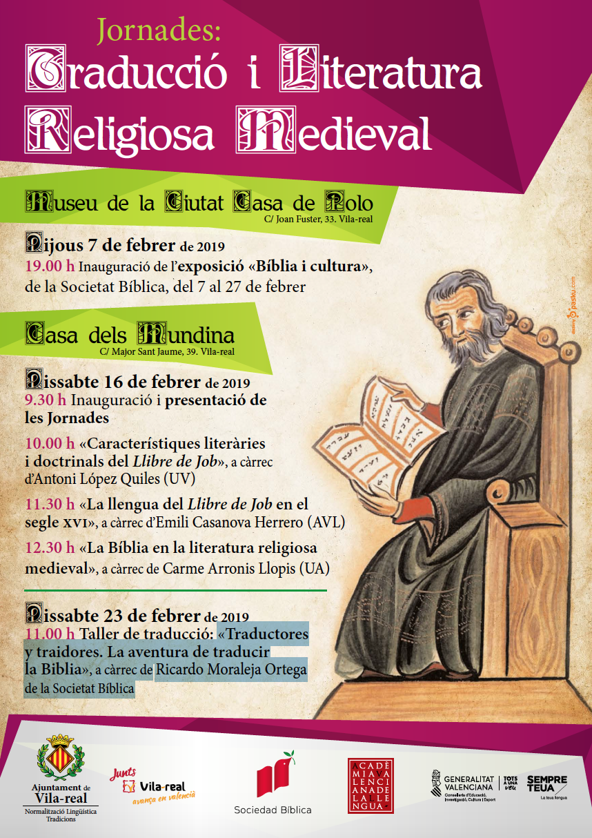 Aquesta especial activitat s’emmarca en la programació de les ‘Jornades. Traducció i Literatura Religiosa Medieval, que comprendran una sèrie de conferències impartides per especialistes en llengua i literatura, que aportaran un punt de vista històric i literari i li donaran una visió centrada en la tradició a les comarques del nord. L’obertura serà el dissabte 16 de febrer a càrrec de l’edil Santi Cortells i el president de l’AVL, el vila-realenc Ramón Ferrer a les 09.30. A les 10.00, la xarrada ‘Característiques literàries i doctrinals del Llibre de Job’, a càrrec d’Antoni López Quiles, professor de la Universitat de València i rector de la parròquia de la Pobla de Fornals. A les 11.30 li seguirà ‘La llengua del Llibre de Job en el segle XVI, a càrrec d’Emili Casanova Herrero, acadèmic de la AVL i catedràtic de la Universitat de València. I a les 12.30, ‘La Bíblia en la literatura religiosa medieval’, a càrrec de Carme Arronis Llopis, professora de la Universitat d’Alacant.