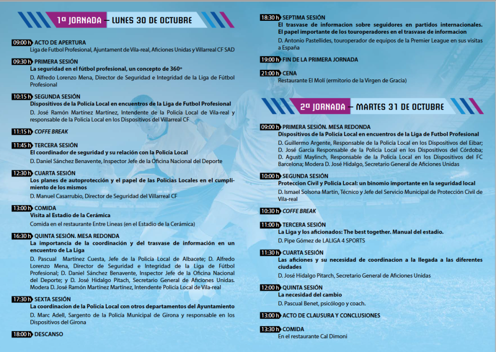 La programació del seminari comptarà amb la participació del director de Seguretat i Integritat de la Lliga de Futbol Professional, Alfredo Lorenzo, responsables de seguretat de diferents clubs, Aficions Unides, o responsables de diversos cossos locals de Policia, entre ells el de Vila-real. Entre les ponències, destaquen les relatives a l'organització de dispositius, la col·laboració amb altres cossos de seguretat i sanitaris, els plans d'autoprotecció en els clubs o la necessitat de coordinació amb les aficions a la seua arribada a les diferents ciutats.