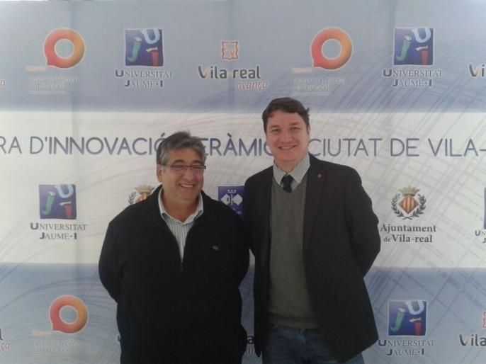 El director de la Cátedra de Innovación Cerámica 'Ciutat de Vila-real', Juan Carda; junto con el concejal de Innovación, Xus Sempere, han anunciado esta mañana en la sede de dicha cátedra, la participación en la feria Cevisama 2014, que se celebrará la próxima semana en Valencia.