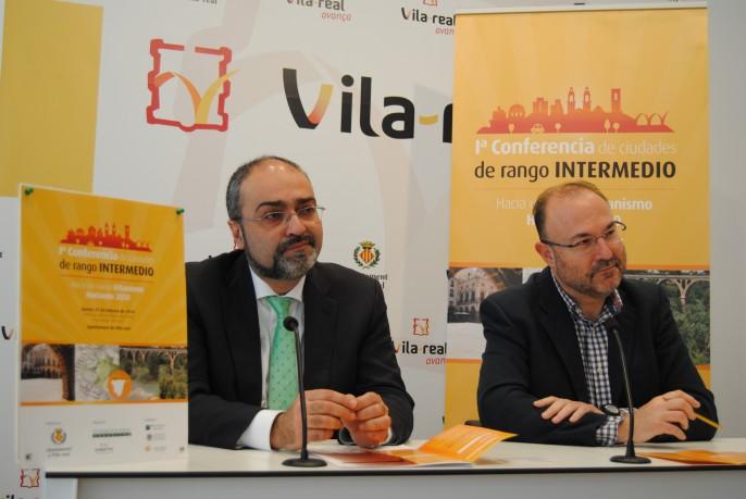 Emilio Obiol, concejal de Territorio y Turismo, junto con José Manuel Miquel Alcañiz, Delegado en la Comunitat Valenciana de la Fundación Fydu, han presentado esta mañana la 1º Conferencia de Ciudades de Rango Intermedio, que se celebrará el próximo jueves 27 de febrero en el Salón de actos de la Fundación Caja Rural de Vila-real.