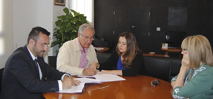 El alcalde, José Benlloch, y la concejala de Servicios Sociales, Mònica Àlvaro, firman el convenio con el presidente de la entidad, Vicente Arrufat, para colaborar en el proyecto de inserción sociolaboral de personas con enfermedades mentales.