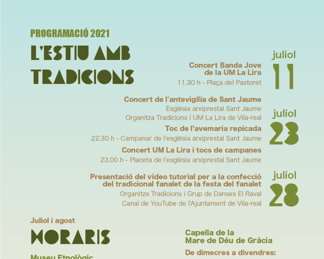 Vila-real ha presentat el cartell de les activitats programades per a aquest estiu per la regidoria de Tradicions, amb concerts de la Unió Musical La Lira i la presentació del tutorial de la Festa del Fanalet per part del Grup de Danses El Raval.