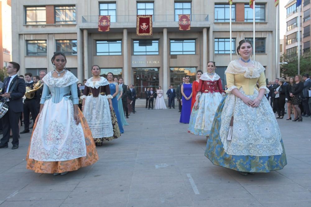 Imatges de la reina i cort d'honor de 2018 en la plaça Major abans de l'acte i la marxa des de la casa de la reina d'enguany fins a l'Auditori acompanyada de la banda de música, autoritats i representants festers.