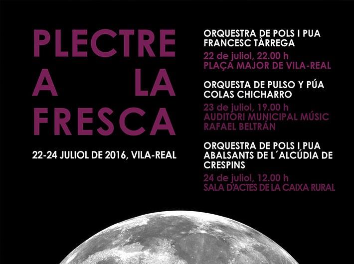 El festival Plectre a la Fresca, organizado por la Orquesta de Pulso y Púa Francisco Tárrega de Vila-real, regresa este fin de semana en su tercera edición, para refrescar el verano en la ciudad con la mejor música de plectro. De la mano de tres orquestas de diferentes puntos del país, el certamen recupera el valor de instrumentos tradicionales como el laúd, la bandurria o la guitarra, de gran arraigo y proyección en Vila-real, en un festival “sencillo y humilde, pero de gran sabor local, que amenizará el fin de semana con las notas de los maestros de la cuerda y el plectro de la mejor manera posible para pasar las noches y tardes del verano, ‘a la fresca”, señala el concejal de Cultura, Eduardo Pérez.