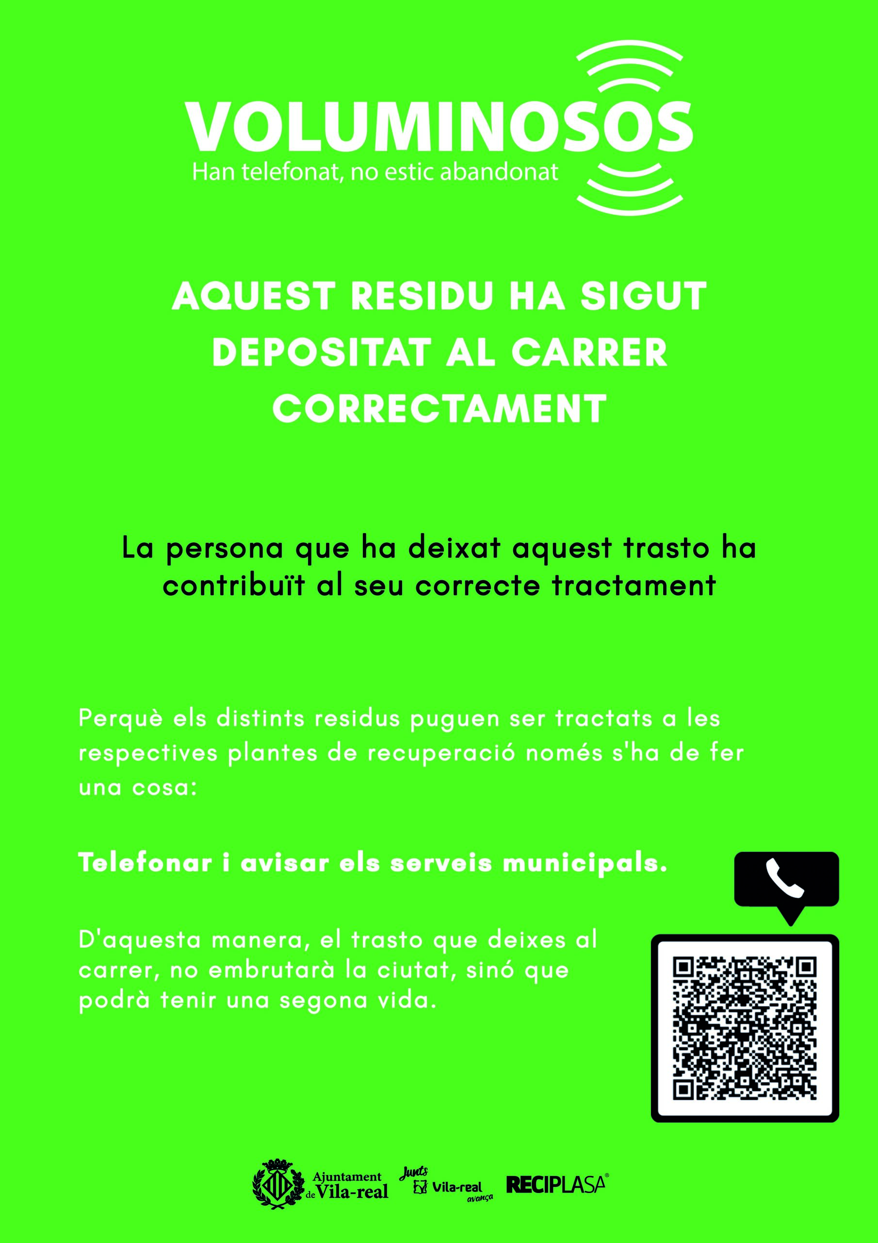 Els cartells, en roig i en verd, amb “un disseny cridaner”, per a assenyalar si el comportament en la zona és l'indicat o no, Reciplana precintarà en els voluminosos. “Pretén reconéixer als veïns que compleixen amb aquest gest, que contribueix al tractament del residu, ja que no tot són gestos de civisme verd, els voluminosos han augmentat un 26%, abandoneu en punts, així que el projecte pretén educar en valors”, assenyala el regidor.