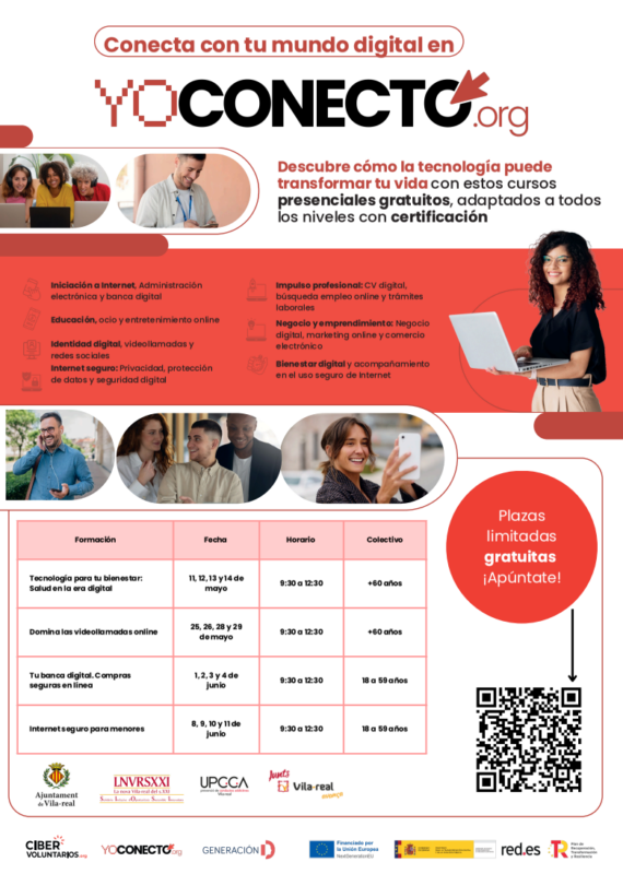 L’Ajuntament de Vila-real, a través de la Regidoria de Sanitat i la Unitat de Prevenció Comunitària de Conductes Addictives (UPCCA), posa en marxa una nova iniciativa formativa amb l’objectiu de millorar les competències digitals de la ciutadania i contribuir a reduir la bretxa tecnològica. El programa, desenvolupat en col·laboració amb la Fundació Cibervoluntarios, s’emmarca en el projecte YoConecto i està adreçat a persones majors de 18 anys.
