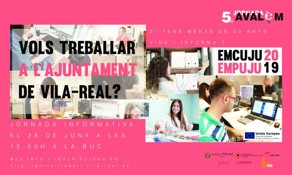 L’Ajuntament de Vila-real, a través de la Regidoria d’Economia, celebrarà el pròxim 28 de juny la cinquena jornada Avalem Joves, que servirà de cloenda als programes d’ocupació que s’han desenvolupat enguany i també per a presentar la nova convocatòria de Avalem, en una sessió informativa oberta a tots els interessats que tindrà lloc a les 12.00 hores a la BUC.