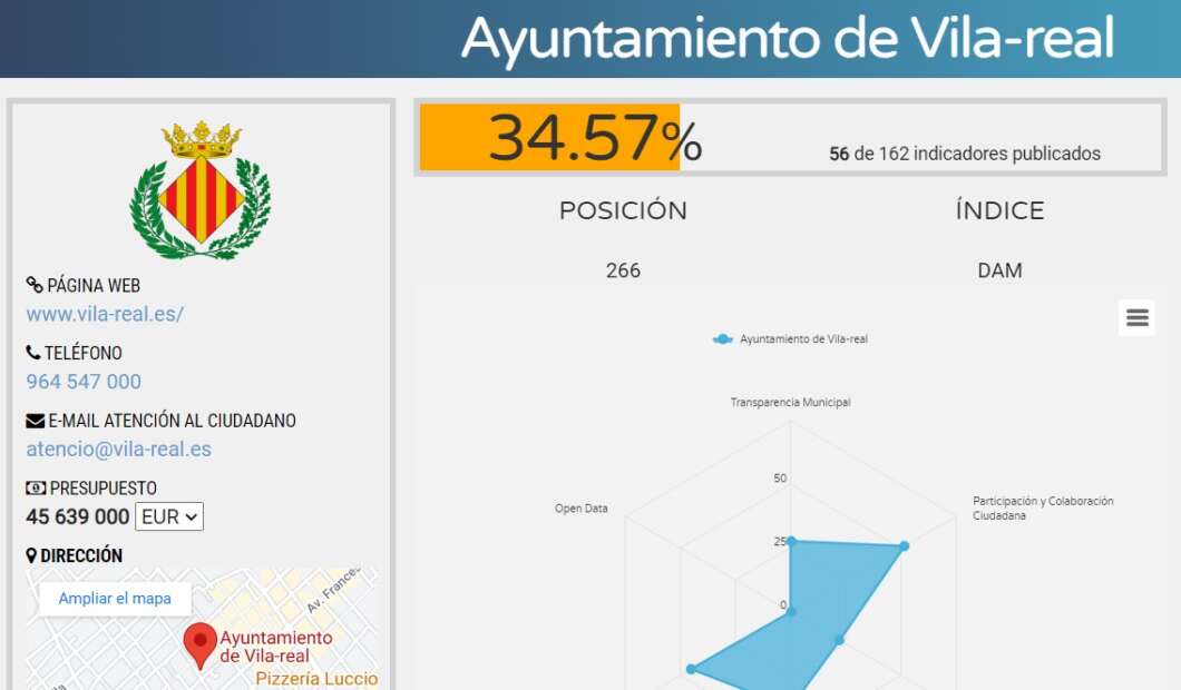 Les últimes dades facilitades per l'observatori Dyntra assenyalen que l'Ajuntament de Vila-real manté en exposició 56 dels 162 indicadors publicats, un fet que redueix fins al global fins al 34,57% i la situa com la sisena localitat de la província en transparència. En aquest 2024, l'informe anual situa al municipi en la posició 41 dels 78 ajuntaments examinats de més de 15.000 habitants de la Comunitat.