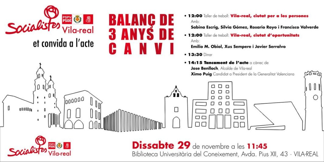 Para ello, la jornada Balanç de 3 Anys de Canvi convocará en la Biblioteca Universitaria del Conocimiento no sólo a militantes y simpatizantes de la formación, sino también a representantes de entidades ciudadanas, empresas y sociedad en general. A su llegada a la jornada, que comenzará a las 12.00 horas (inscripciones, a las 11.45 h.), los asistentes se adscribirán a cada una de las mesas de trabajo en función de sus intereses: en Vila-real, ciudad para las personas se abordará el balance y perspectivas de futuro en ámbitos como la educación, servicios sociales, la proximidad, los servicios públicos, la salud o el deporte; por su parte, la mesa Vila-real, ciudad de oportunidades reflexionará sobre aspectos más directamente vinculados al modelo económico de ciudad impulsado por los socialistas, en sectores como la innovación, el desarrollo sostenible, el futuro del territorio, las posibilidades del turismo o las políticas de reducción de impuestos impulsadas por el gobierno de Benlloch.