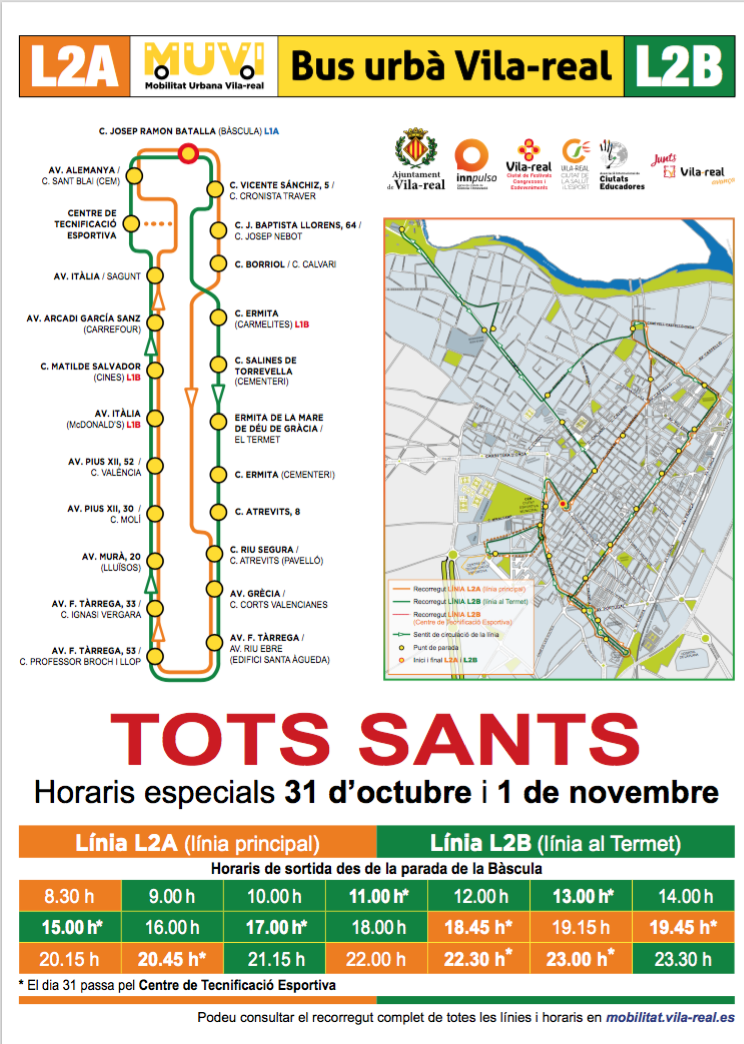 La commemoració del dia de Tots Sants comptarà, com cada any, amb un dispositiu especial, en el qual destaca el servei d'autobús especial per a garantir el transport públic i gratuït a tots els vila-realencs que vulguen acostar-se al cementeri eixe dia o la vespra. Per a això, el bus Groguet es reforça i adapta els seus horaris els dies 31 d'octubre i 1 de novembre.