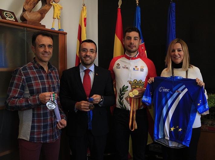 La corporación municipal de Vila-real, presidida por el alcalde, José Benlloch, y la concejala de Deportes y Salud, Silvia Gómez, ha recibido hoy en la sala de plenos del Ayuntamiento al ciclista vila-realense Sebastián Mora Vedri, para hacerle entrega de un maillot con la imagen y la marca de la ciudad en reconocimiento a sus éxitos deportivos y como apoyo del consistorio a la trayectoria ascendente del ciclista olímpico vila-realense. “Es un orgullo contar en Vila-real con deportistas reconocidos internacionalmente como Sebastián Mora, ciclista olímpico y campeón de Europa de Madison y Scratch en 2015 quien, además, destaca por su calidad humana y por estar siempre dispuesto a colaborar en las actividades que promueve la ciudad, en particular con las vinculadas a la promoción de los valores del deporte y de la bicicleta entre los más jóvenes”, señala Benlloch. El alcalde ha querido destacar la trayectoria del ciclista, con más de 60 títulos desde que comenzó a competir profesionalmente hace apenas cinco años.