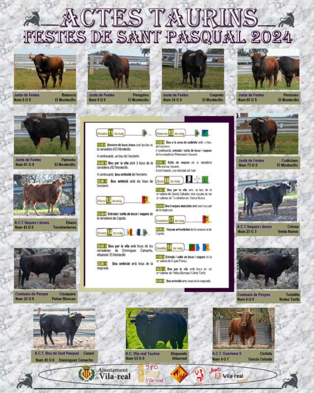L’Ajuntament de Vila-real i la Junta de Festes han presentat el cartell taurí de Sant Pasqual, que suposarà l’exhibició d’11 bous cerrils i dos vaques. Els festejos populars es distribuiran entre els dissabtes 11 i 18 de maig amb l’excepció de diumenge i la jornada en honor al sant.