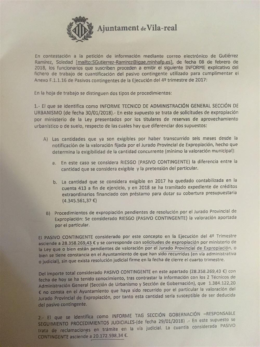 “El Ministeri d’Hisenda està preocupat per la situació de l’Ajuntament i ens ha demanat un informe tècnic que detalle d’on provenen els 48,5 milions d’euros de risc urbanístic de l’Ajuntament a curt termini”, així és com ha descrit l’alcalde de Vila-real, José Benlloch, la situació econòmica en la qual està immersa la ciutat i que han portat al fet que s’haja incomplit el Pla Econòmic i Financer, com va anunciar la setmana passada. El document desglossa el risc urbanístic existent “a causa de les sentències i altres conflictes heretats i la quantitat total és la mateixa que el pressupost anual del consistori, el que indica la gran amenaça que suposa per als comptes”.