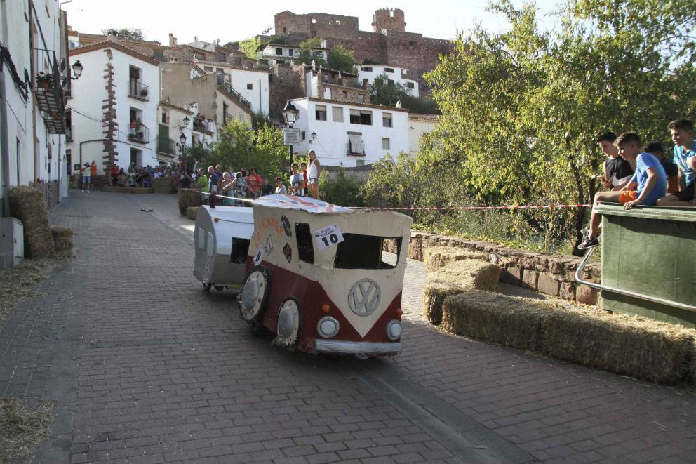 La segunda edición de la carrera de 'Cotxes bojos' "enloqueció" al numeroso público de Vilafamés que se acercó a presenciar, de primera mano, esta competición de vehículos inverosímiles y coloristas señalada por muchos cómo una de las actividades que nadie se puede perder durante las fiestas de agosto. Este año han sido 19 los participantes, superando así el número de coches inscritos el año pasado, un hecho que consolida esta joven iniciativa que premia la originalidad y la velocidad de unos vehículos que no pueden contar con sistemas de propulsión, y que tienen que tener al menos tres ruedas, dirección y frenos.