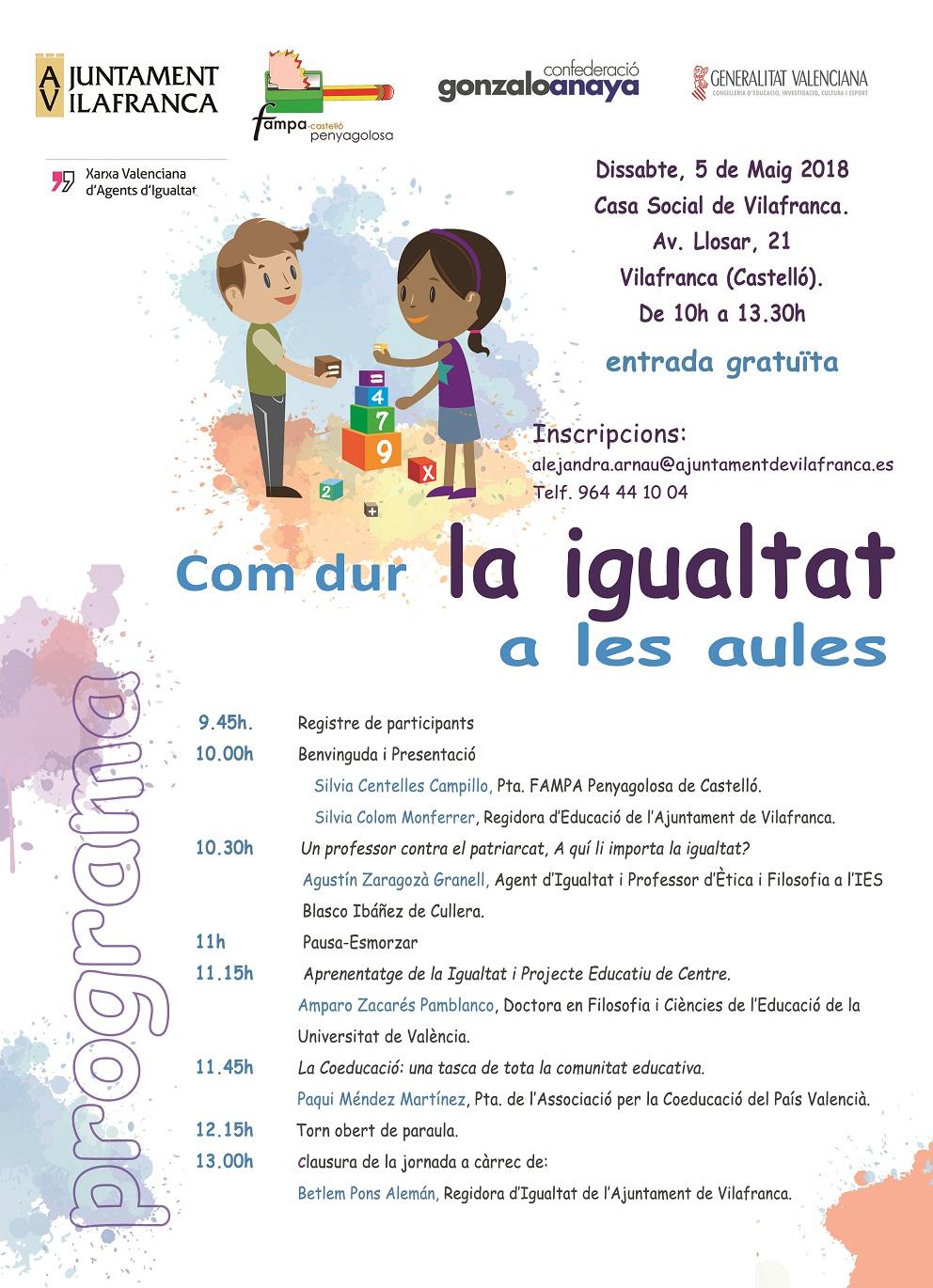 En les diferents ponències es tractaran temes com la igualtat de gènere, familiar, sexual o afectiva. Així, la jornada d'obertura serà a les 10.00 hores i serà duta a terme per la presidenta de la Fampa Penyagolosa, Silvia Centelles, i la regidora d'Educació de l'Ajuntament de Vilafranca Silvia Colom. A continuació, tindrà lloc la conferència "Un professor contra el patriarcat, a qui li importa la igualtat?" per Agustín Zaragozà, agent d'igualtat i professor d'ètica i filosofia en l'IES Blasco Ibáñez de Cullera.