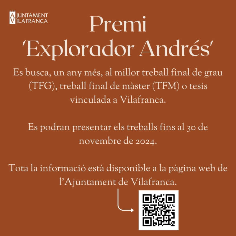 L'Ajuntament de Vilafranca, en col·laboració amb la Universitat Jaume I de Castelló, ha obert la convocatòria per al Premi Explorador Andrés. Aquesta iniciativa, creada l'any 2014 per celebrar l'aniversari de la Carta Pobla, té com a objectiu fomentar la investigació, donar a conéixer aspectes rellevants del municipi i posar en valor aquells projectes destinats a la millora i el coneixement de Vilafranca.