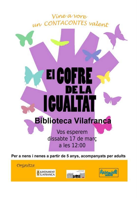 A las 12 horas esta programado el cuentacuentos 'El Cofre de la Igualtat' en la Biblioteca de Vilafranca. Va destinado a niños y niñas a partir de 5 años que vayan acompañados por adultos.