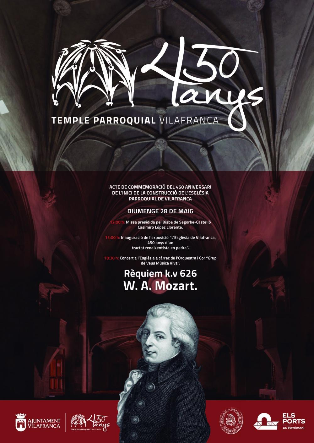 El domingo 28 de mayo Vilafranca conmemorará el 450 aniversario del inicio de las obras de construcción de la iglesia parroquial de Santa María Magdalena. La jornada contará con una misa presidida por el obispo de la diócesis de Segorbe-Castellón, Casimiro López. A continuación se inaugurará la exposición 'La iglesia de Vilafranca, 450 años de un tratado renacentista en piedra'. Por la tarde tendrá lugar el concierto de la orquesta y coro del "Grup de Veus Música Viva" que interpretará el Réquiem k.v 626 de W.A. Mozart. Los actos están organizados por el Ayuntamiento de Vilafranca y la parroquia de Santa María Magdalena.
