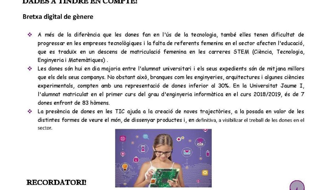 L'Agència d'Igualtat de l'Ajuntament de Vilafranca ha donat a conéixer que avui, 25 d'abril, se celebra el Dia internacional de les xiquetes en les Tecnologies de la Informació i Comunicació (TIC).