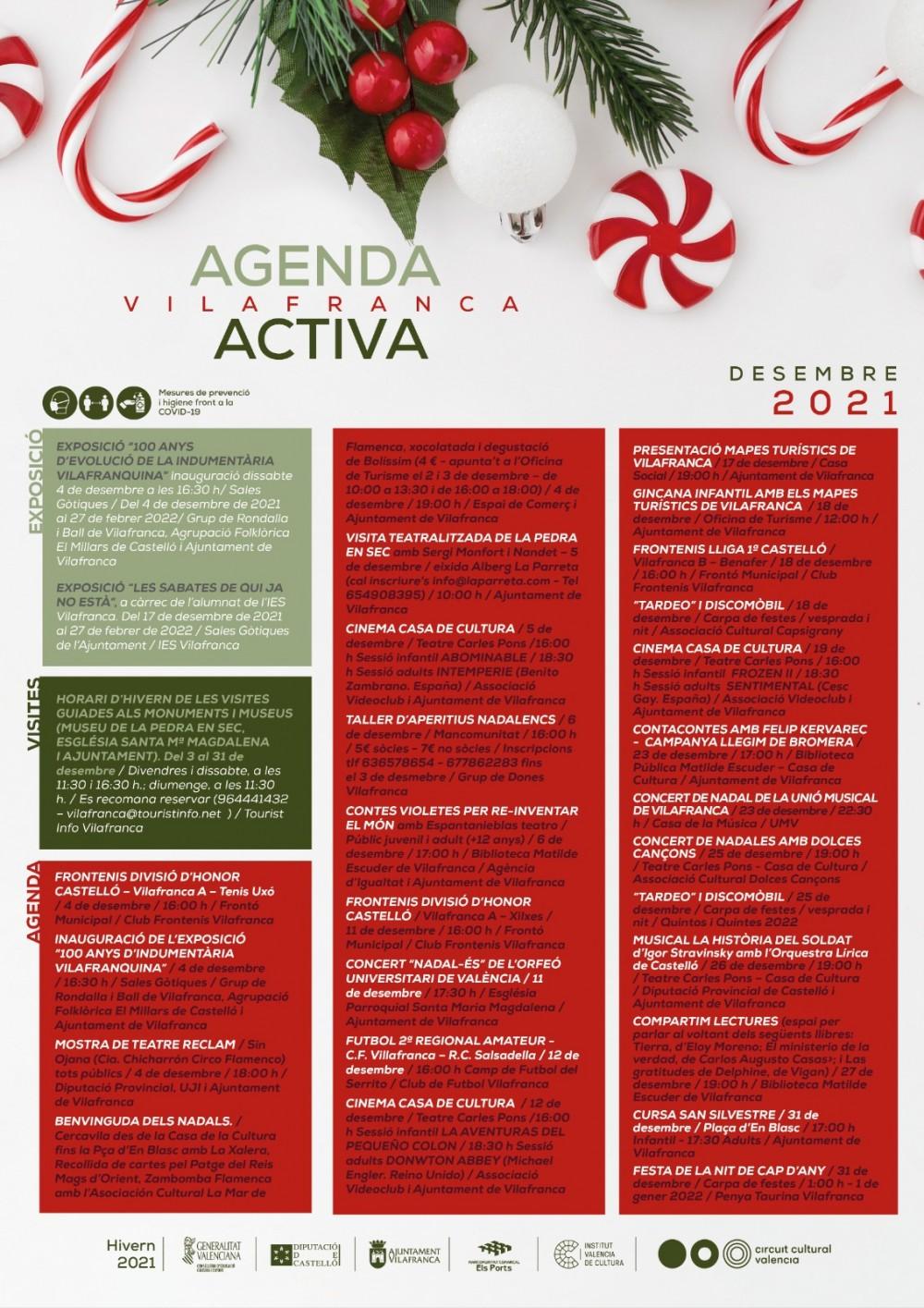 La localidad de Vilafranca ha preparado un mes de diciembre cargado de actos y eventos culturales para todos los gustos que podrán disfrutar los vecinos y vecinas, así como los visitantes que quieran acercarse. Así pues, en la agenda cultural de Vilafranca se han incluido actos y eventos pensados para satisfacer a pequeños y adultos, con una variedad que va desde conciertos musicales en directo, degustaciones culinarias o sesiones de cine. También se ha incluido la actualidad deportiva del Club de Fútbol Vilafranca y del Club Frontenis Vilafranca.