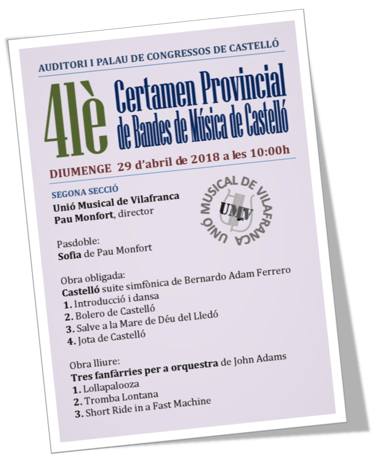 La Unió Musical de Vilafranca participarà el diumenge 29 d'abril en la 41 edició del Certamen Provincial de Bandes de Música que tindrà lloc en l'Auditori i Palau de Congressos de Castelló. La formació dirigida per Pau Monfort actuarà aproximadament entre les 12.30 i les 13 hores dins de la Segona Secció.