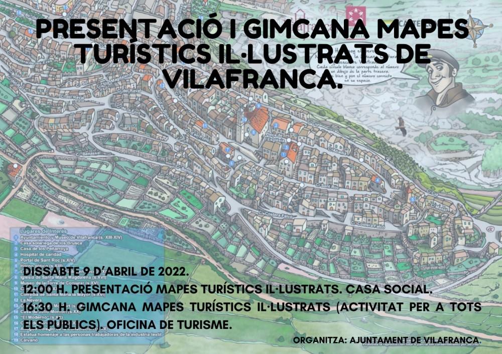 La programació cultural de Vilafranca del dissabte 9 i diumenge 10 d'abril estarà marcada per quatre esdeveniments en el qual es tractaran diversos temes com el turisme local, la crisi d'Ucraïna o la música en directe. Així, el dissabte 9 a les 12h es presenten oficialment els mapes turístics il·lustrats de Vilafranca, en un esdeveniment apte per a tots els públics a la Casa Social. A la vesprada s'aprofiten aquests mapes per a realitzar una gimcana per la localitat, una iniciativa que estarà disponible per a veïns, veïnes i visitants en l'Oficina de Turisme de la localitat.
