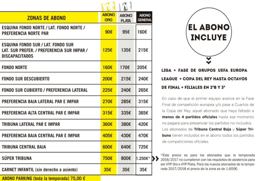 Los VYP podrán seguir disfrutando del mejor fútbol al mejor precio, ya que podrán disfrutar de las tres competiciones desde los 90 euros al año. El club se compromete a mantener el precio de los abonos a los VYP las dos próximas temporadas (2017-2018 y 2018-2019), siempre y cuando se logre la asistencia mínima para entrar en dicha categoría. Con esta política, la diferencia del abono General al abono VYP irá aumentando progresivamente en los próximos años.