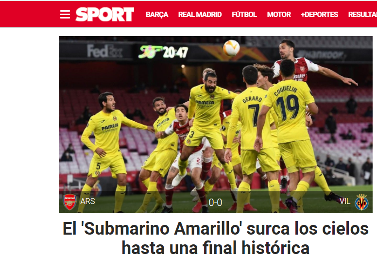Los periódicos digitales españoles se están haciendo eco de la hazaña lograda por el Villarreal logrando el pase a la final de la Europa League, que le enfrentará al Manchester United el próximo 26 en Polonia. Uno de los más significativos se puede leer en el diario Sport: "El 'Submarino' Amarillo surca los vídeos hasta una final histórica". Por su parte, en Mundo Deportivo se puede leer "El Villarreal firma su primera final continental". "Cinco noches necesitó el Villarreal en su historia hasta encontrar la gloria de una final continental. De la mano de Emery, experto en la Europa League. Una vez más, el entrenador vasco probó ser un aventajado en un torneo que se le da de maravilla".