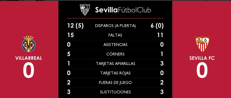 El equipo de Fran Escribá seguía golpeando, aunque sin éxito. De nuevo Borré, muy activo desde que saltó al campo, tuvo el gol en su bota con otro potente disparo tras una excelente colectiva del ataque amarillo. Sergio Rico volvió a evitar el tanto del colombiano (m. 65). El Villarreal lo intentó hasta el final, pero no pudo batir al guardameta con conjunto hispalense.