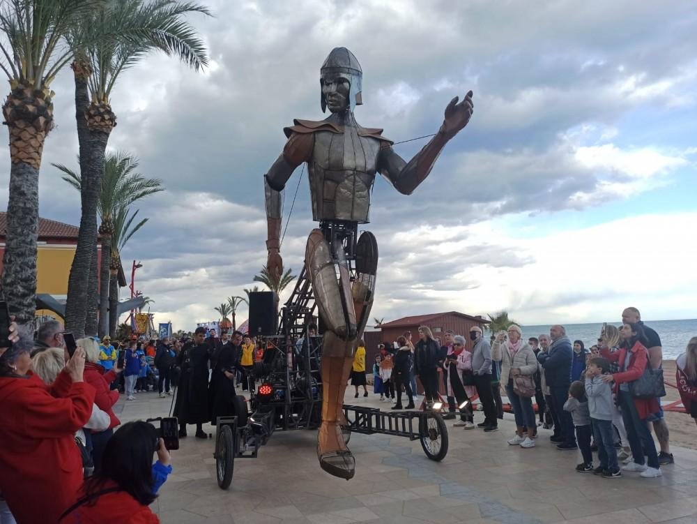 Pasadas las seis y media de la tarde se iniciaban las fiestas del Carnaval de Vinaròs, que este año llegan a su cuarenta aniversario. Con el espectáculo Aquiles, de la compañía La Fam, arrancaba el acto de llegada del rey carnal frente al antiguo corral de Batet. Los integrantes de las 31 comparsas, con sus estandartes, estaban esperando el inicio del carnaval. Tras la llegada de Carnestoltes se iniciaba un pasacalle hasta los jardines del antiguo convento de San Francisco donde el rey carnal era recibido por el grupo de musical de Puro Teatro Arts Escèniques, la bailarina María Boluda y la orquesta de la Sociedad Musical La Alianza.