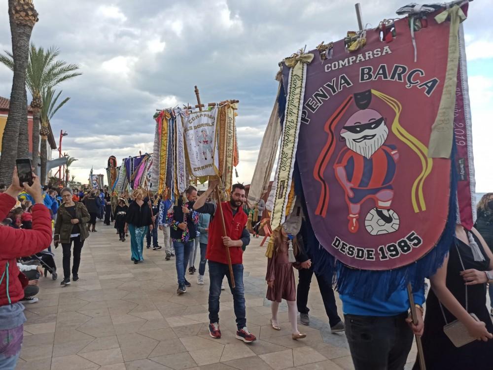 Seguidamente se iniciaba un pasacalle con la charanga La Marxa hasta el recinto del Carnaval, situado en el paseo Fora Forat. Durante el pasacalle se realizaba una parada en el Ayuntamiento para izar la bandera del Carnaval que ondeará durante todas las fiestas. A las nueve y media en la carpa del recinto del Carnaval se iniciaba la cena e imposición de las bandas a las reinas y reyes del carnaval.