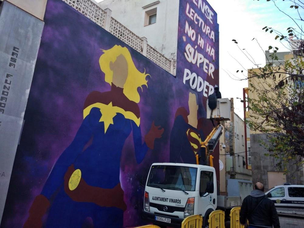 'Sense lectura no hi ha super poder', esta es la frase que corona el nuevo mural que el grafitero vinarocense Francisco López 'Chile' está realizando en la plaza Hort dels Escribano, a pocos metros de uno de los accesos de la biblioteca municipal.