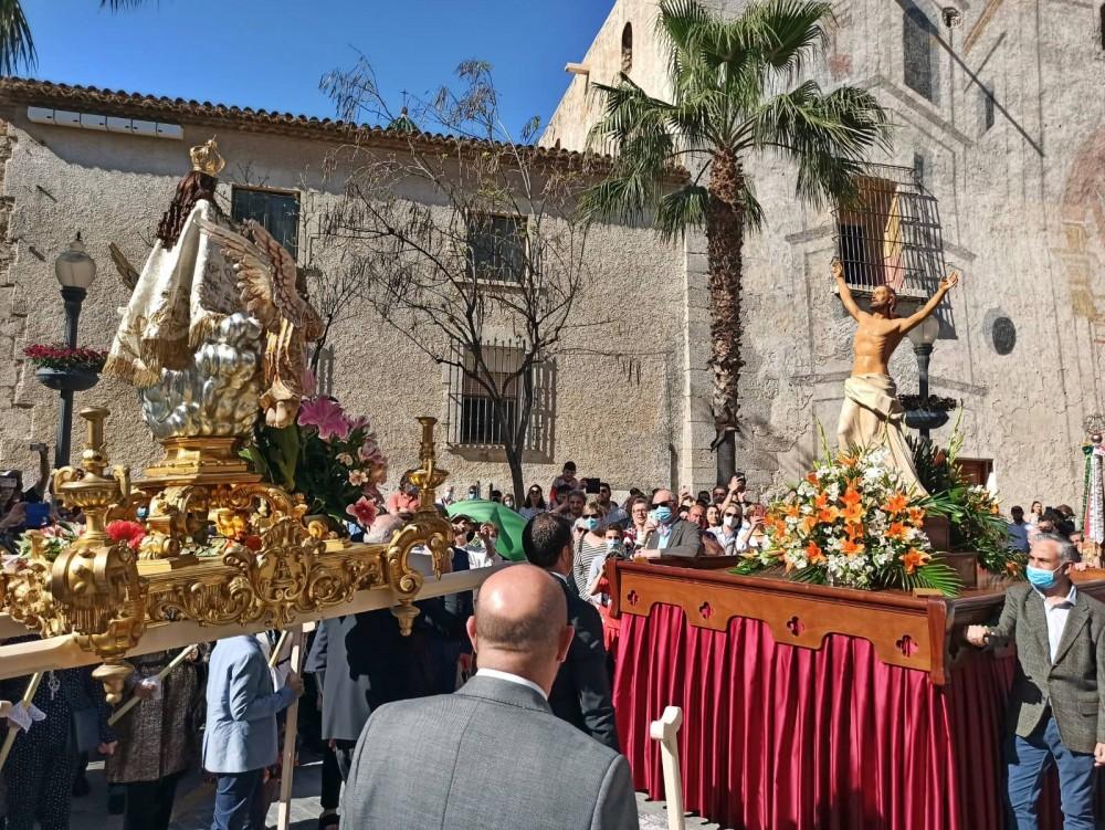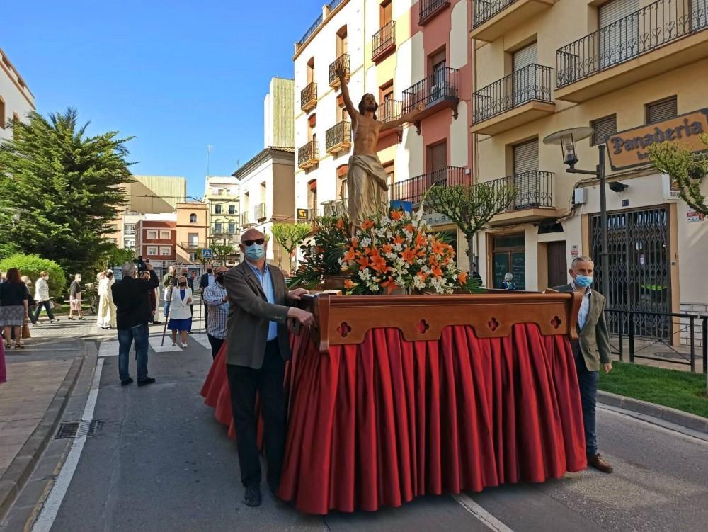 Desde la iglesia arciprestal salía la imagen de Jesucristo Resucitado, seguida de la cofradía del Santísimo y autoridades municipales y eclesiásticas, así como la banda de música de la Societat Musical La Alianza.