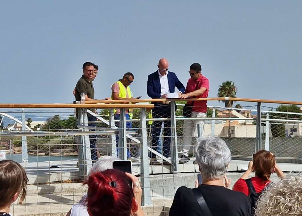 Esta mañana se ha realizado el acto de recepción de las obras de la pasarela ciclopeatonal de la desembocadura del rio Cervol en Vinaròs. Una docena de personas han seguido el acto e irrumpido en aplausos en el momento en que técnicos municipales y de la empresa firmaban la documentación por la que el consistorio recepcionaba estas obras.