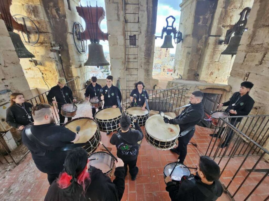 A las seis y media de la tarde se iniciaba el VII Toque excepcional en el campanario de la Banda de Bombos y Tambores de la Cofradía del Cristo de la Paz. Los integrantes de la banda han subido hasta la sala de campanas desde donde han realizo el toque.