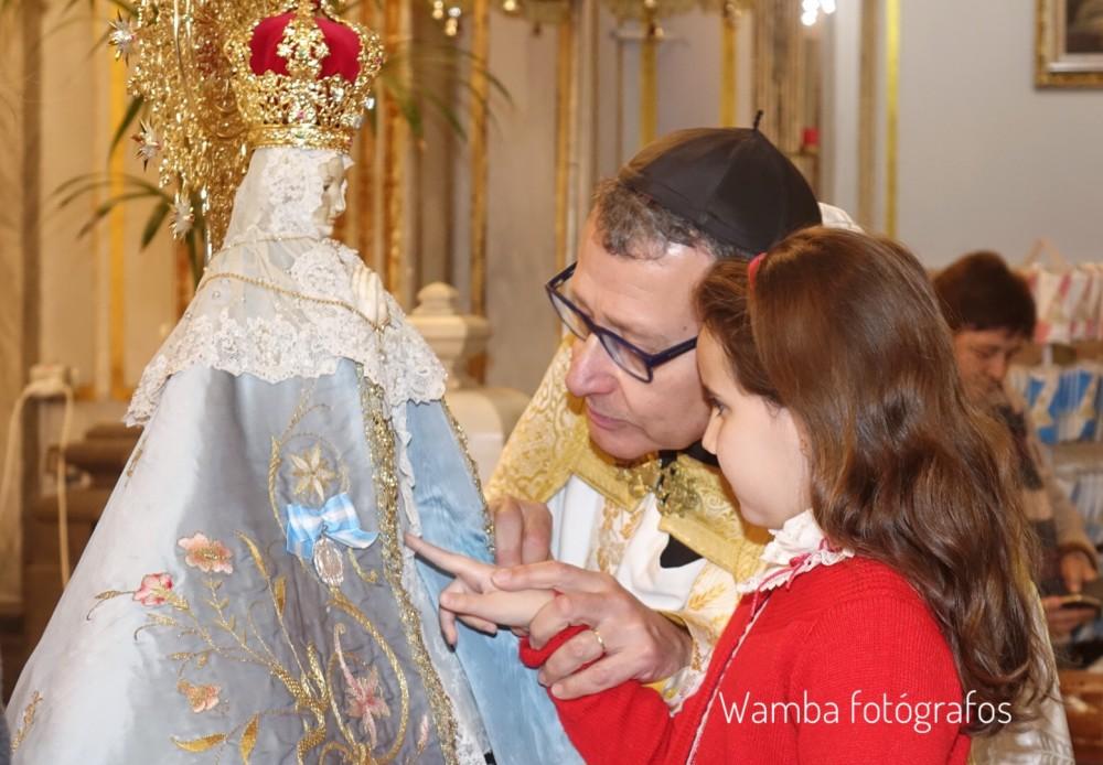 Durante dos largas horas, desde la doce hasta las dos del mediodía se fue sucediendo el paso de los fieles ante la Virgen del Lledó. Especialmente emotivo fue el paso de familias al completo, con los padres, los hijos y los abuelos. Muchos de ellos también “pasaron” por la imagen los paños, que como prolongación del manto, había preparado la Basílica del Lledó como recuerdo.
