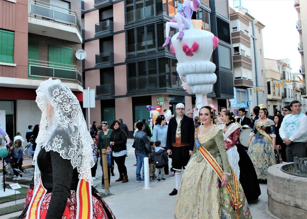En la Plaça Major, just en el punt on ja fa dies que està muntat l'escenari i el gran tapís que acolliran l'Ofrena, ha finalitzat la Visita Oficial amb el lliurament del Faller d'Honor a les dues màximes representants d'aquest any, les Reines Falleres Elena Collado Torralba i Silvia Martínez Bodí.