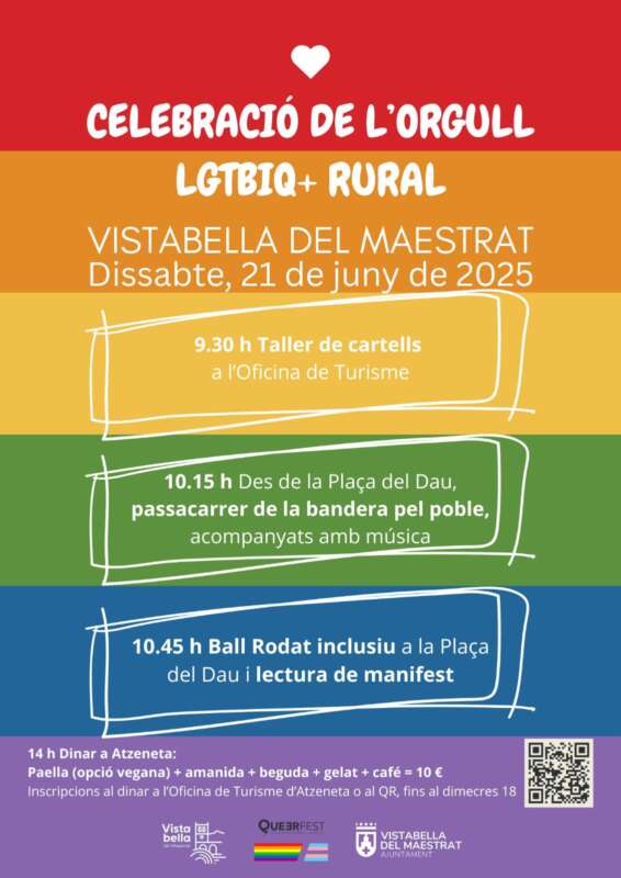 Vistabella del Maestrat tornarà a ser referent en la defensa dels drets LGTBIQ+ en l’àmbit rural amb una jornada plena d’activitats per a commemorar el Dia de l’Orgull. El dissabte 21 de juny, el municipi viurà una jornada reivindicativa que combina cultura, tradició i acció institucional en defensa de la llibertat d’estimar i de ser.