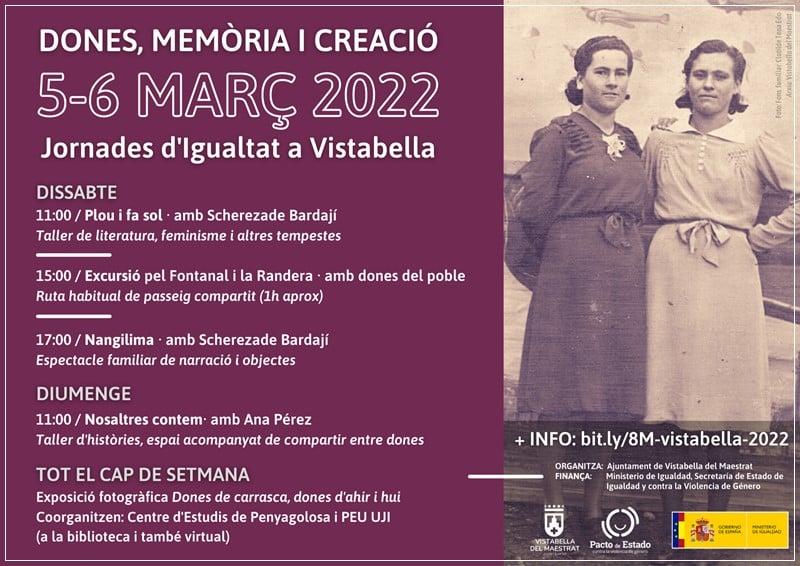 Amb motiu del Dia Internacional de la Dona que se celebra el pròxim 8 de març, l'Ajuntament de Vistabella del Maestrat ha organitzat les Jornades d'Igualtat 'Dones, memòria i creació' amb les quals fer reflexionar sobre el paper de les dones ahir i hui, així com compartir un espai de trobada amb tallers, activitats familiars i exposicions per a crear juntes i junts.