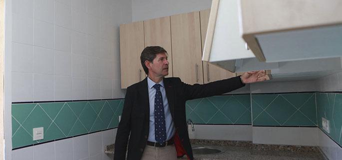 El alcalde de Castellón, Alfonso Bataller, ha destacado hoy el compromiso del Ayuntamiento de Castellón con las personas más necesitadas de la ciudad y que materializamos en diversos proyectos y en las viviendas sociales “cuyas obras de remodelación hoy visitamos y que pondremos a disposición de estas familias en el menor tiempo posible ya que estarán finalizadas e próximo mes”. Bataller, quien ha estado acompañado por la concejala de Bienestar Social, Carmen Querol, ha agradecido también a los alumnos del Taller de Empleo de la Ciudad de la Solidaridad por el trabajo que están realizando en la adecuación de estos pisos sociales y a Grespania y Taugres, que han donado el pavimento cerámico para las viviendas.