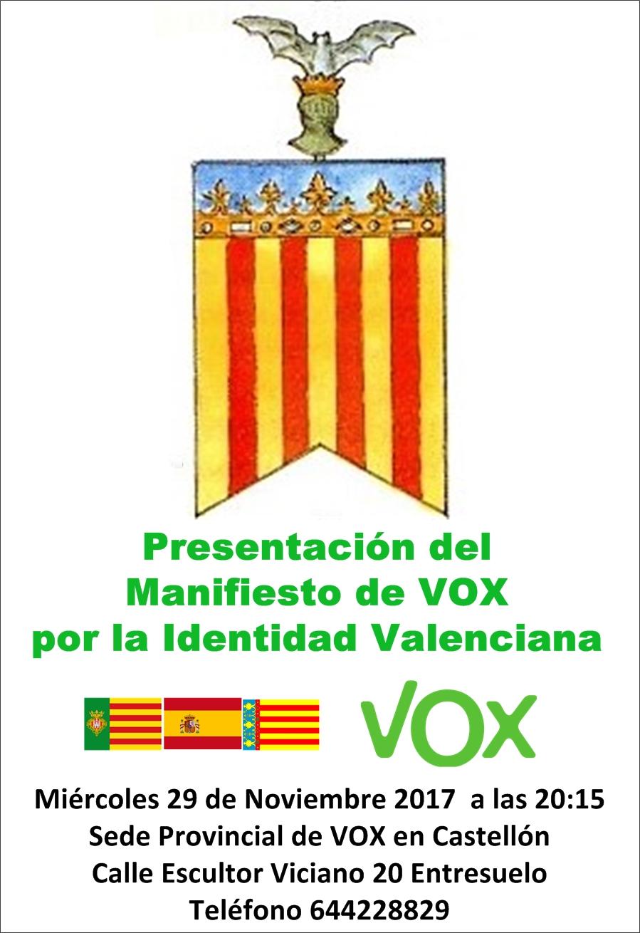Vox ha informado que su 'Manifiesto por la Identidad Valenciana' se presentará la próxima semana en Castellón en la sede provincial de VOX, en la calle Escultor Viciano 20 entlo., a las 20:15 h. El acto estará abierto a todo el público que desee asistir. La presidente provincial de VOX ha declarado “en estos momentos complicados de nuestra historia alguien debía actuar, y como ya hemos visto últimamente en otras regiones de España VOX actúa, y como dice nuestro presidente Santiago Abascal, si nosotros no estamos nadie lo dirá, y yo añado, si nosotros no lo hacemos nadie lo hará”.