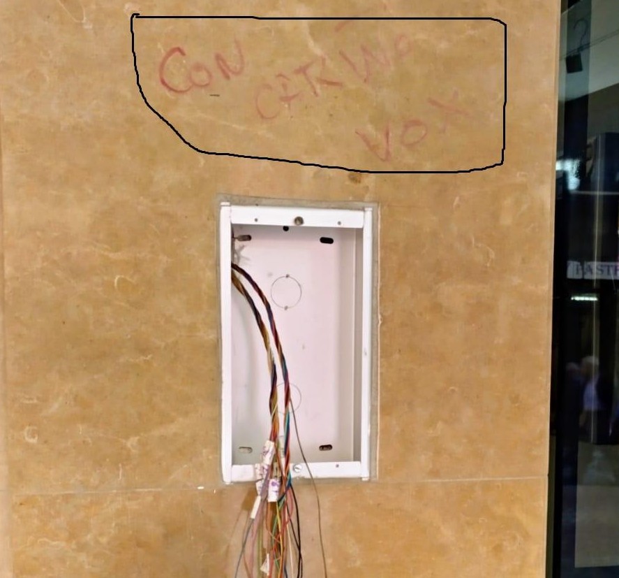El cuadro de timbres de edificio donde VOX tiene su sede, en Escultor Viciano nº20, ha sido arrancado por los terroristas de la extrema izquierda dejando un mensaje: ”Con cariño VOX”