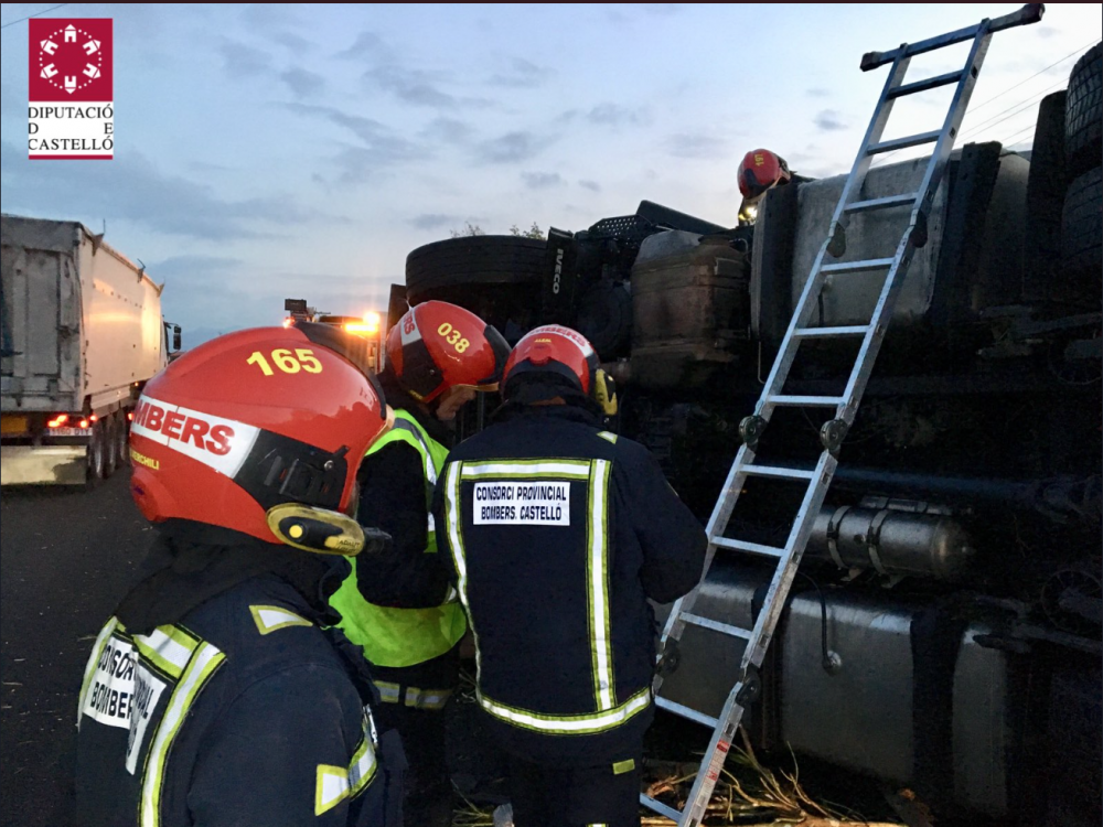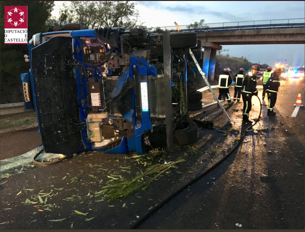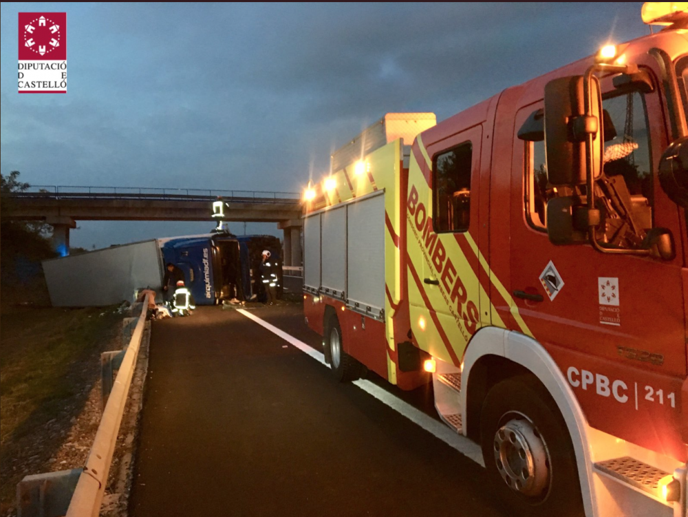 Alrededor de las 07.30 el Servicio de Información del CPBC ha alertado de un accidente en la AP7 entre Vila-real y Almassora. Un camión ha volcado y se ha producido una fuga de gasoil del depósito y podría haberse derivado un posible incendio pero finalmente no ha ocurrido ya que se ha controlado la situación. Afortunadamente no hay heridos y una dotación del Parque Plana Baixa se ha movilizado al lugar de los hechos. Los Bomberos van a colaborar con grúa en la retirada del camión para asegurar zona debido a fuga depósito del camión.